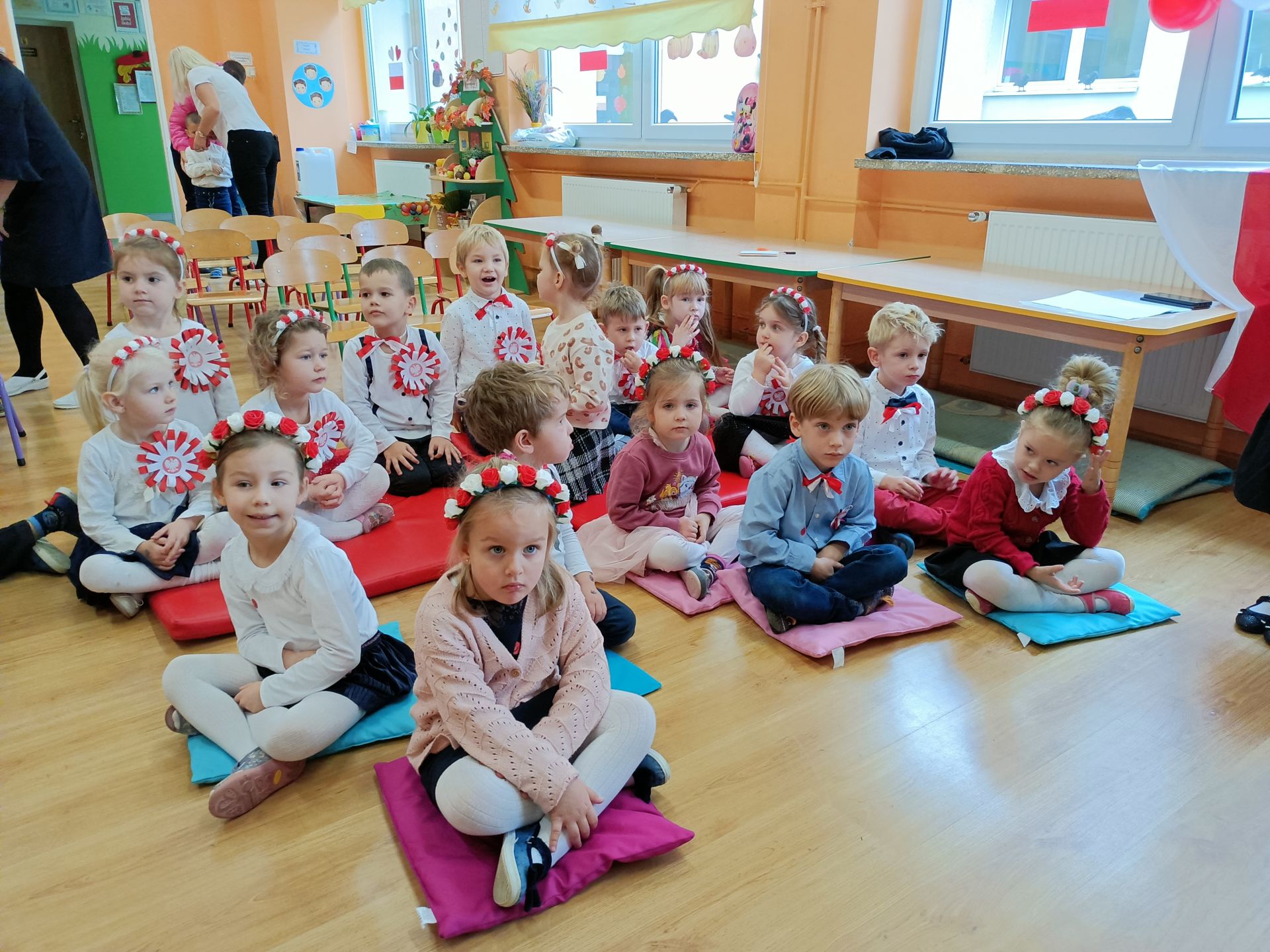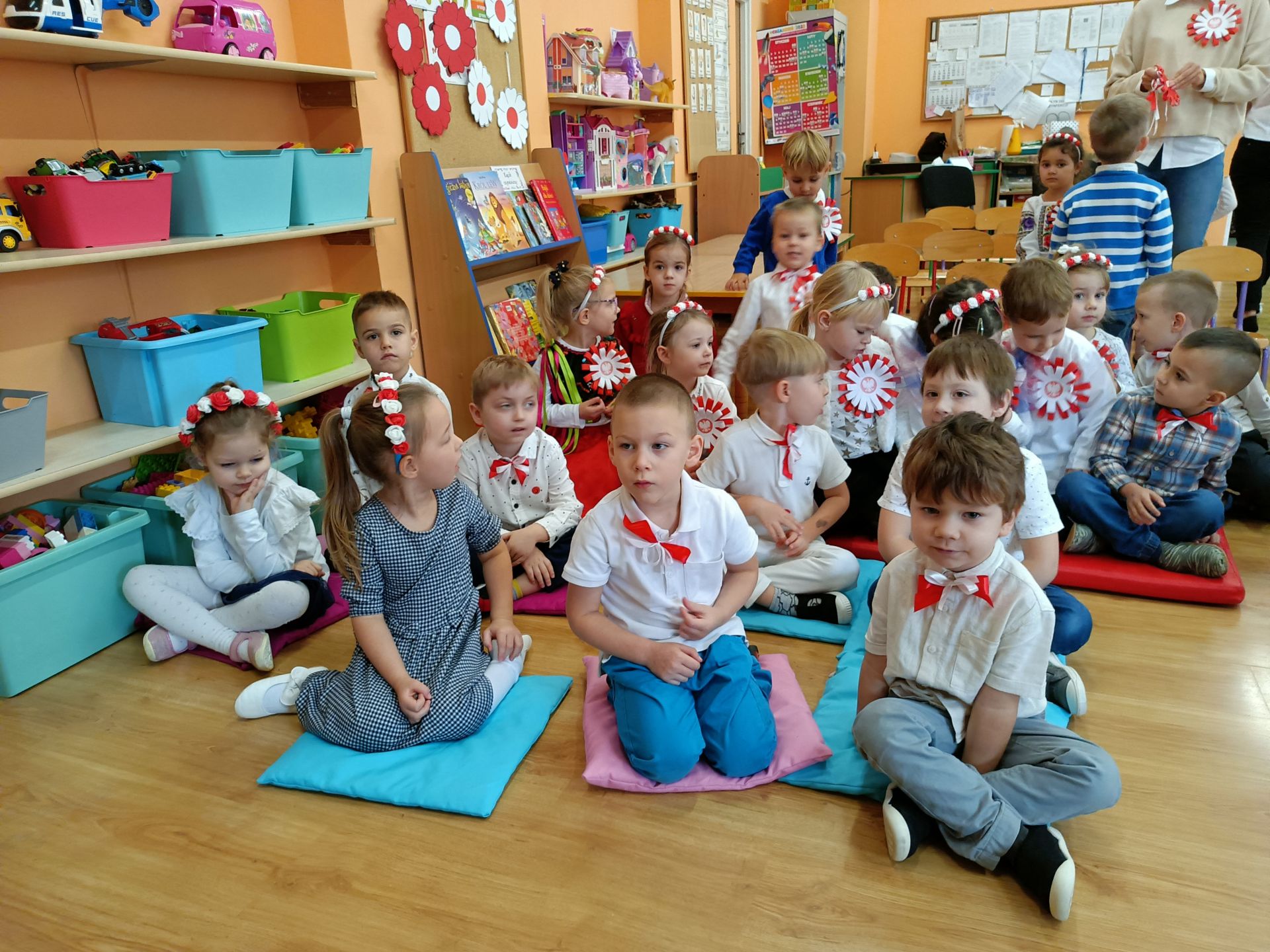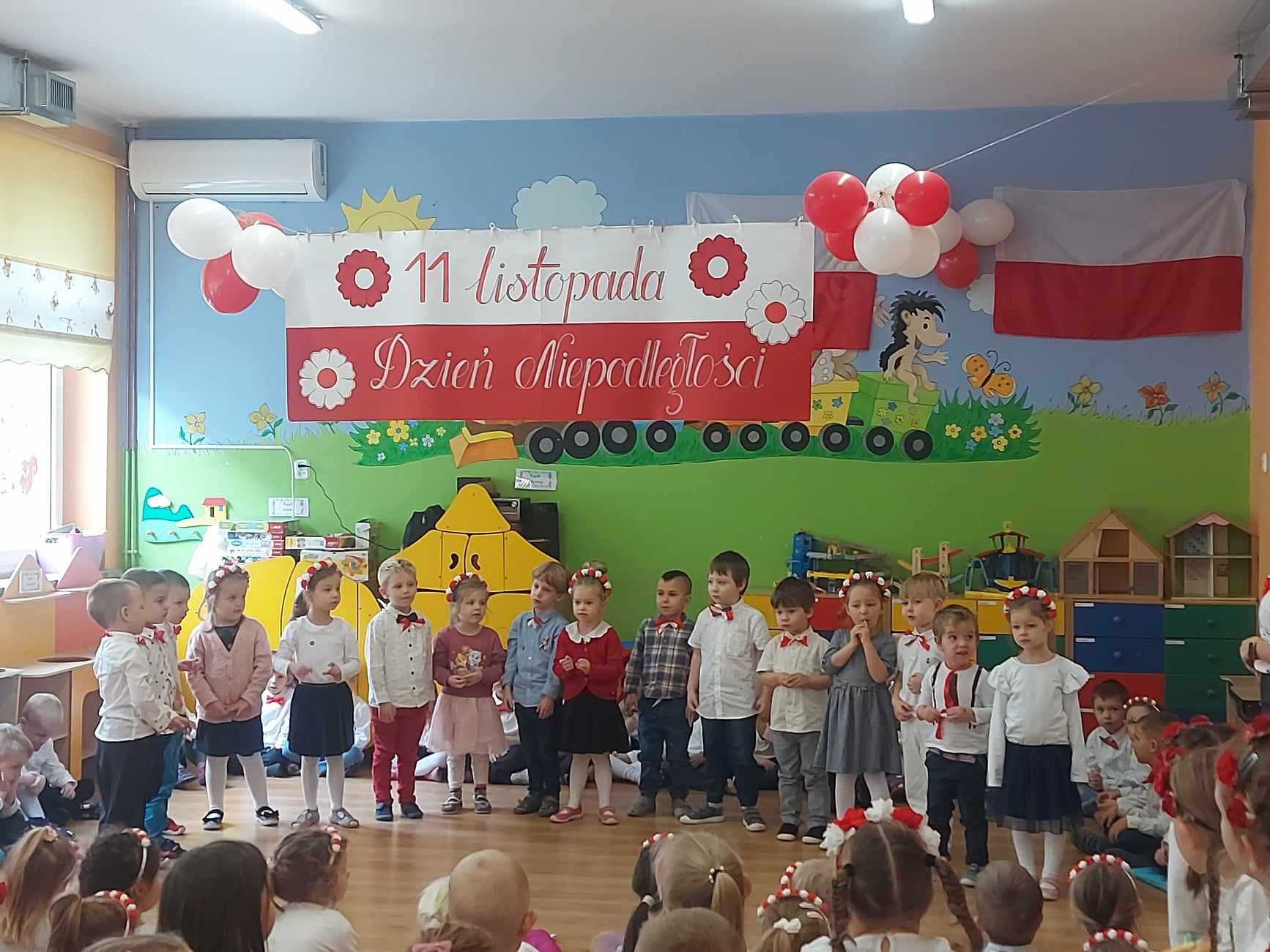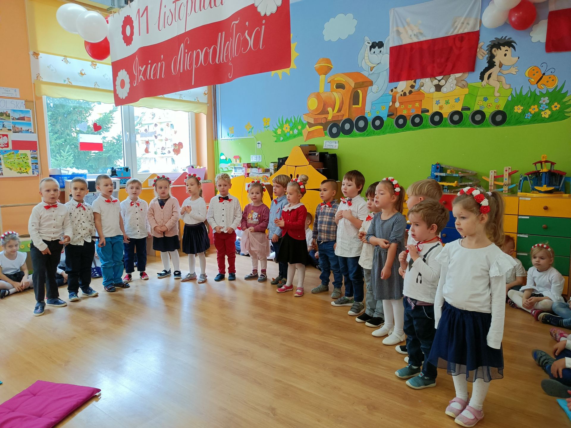 Dzień Niepodległości, 11 listopada to ważny dzień dla naszej Ojczyzny. Wraz z innymi przedszkolakami śpiewaliśmy hymn i pieśni patriotyczne, dając wyraz patriotyzmu swoją postawą i zaangażowaniem. Jesteśmy dumni z bycia Polakami.