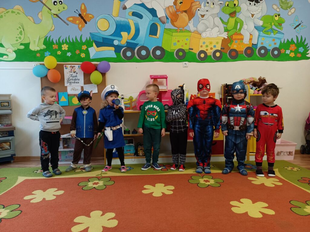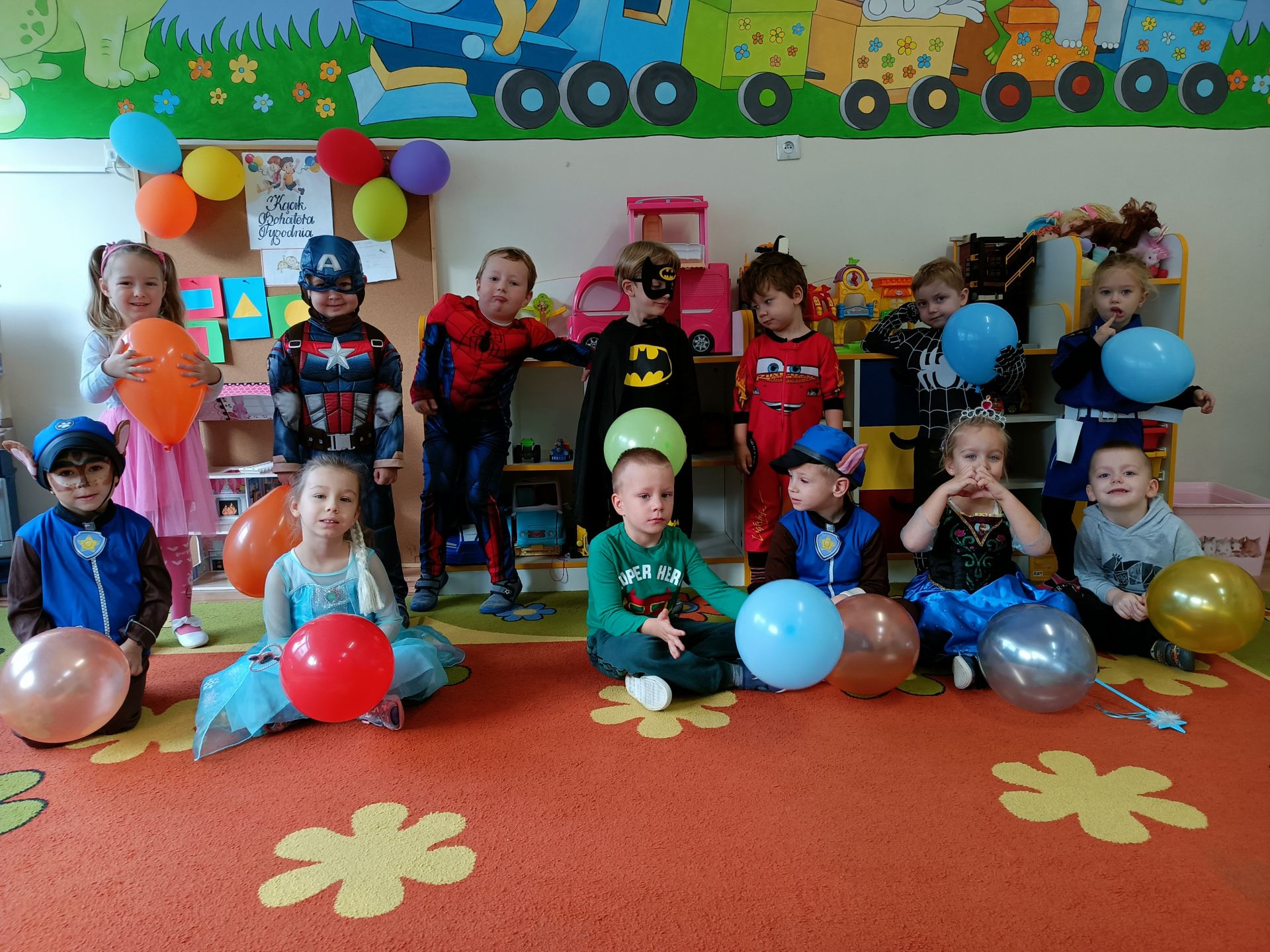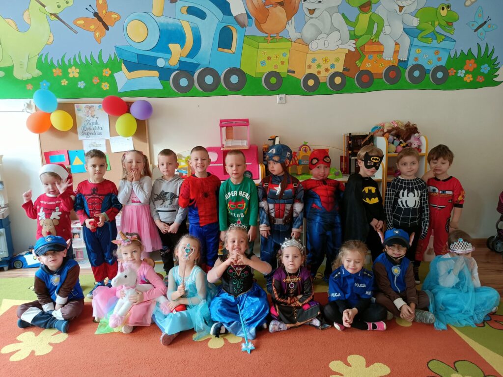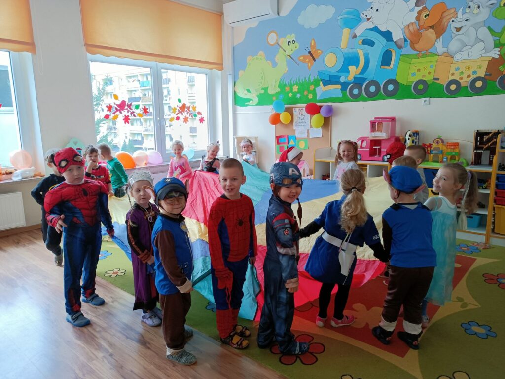 Dziś w sali Dinusiów gościliśmy księżniczki, superbohaterów, postacie z Psiego Patrolu, przyszła nawet Świnka Peppa i Policjantka. Były tańce, konkursy, pokaz mody, zabawy chustą animacyjną i balonami. A hitem imprezy okazała się piosenka „Wyginam ciało śmiało”.