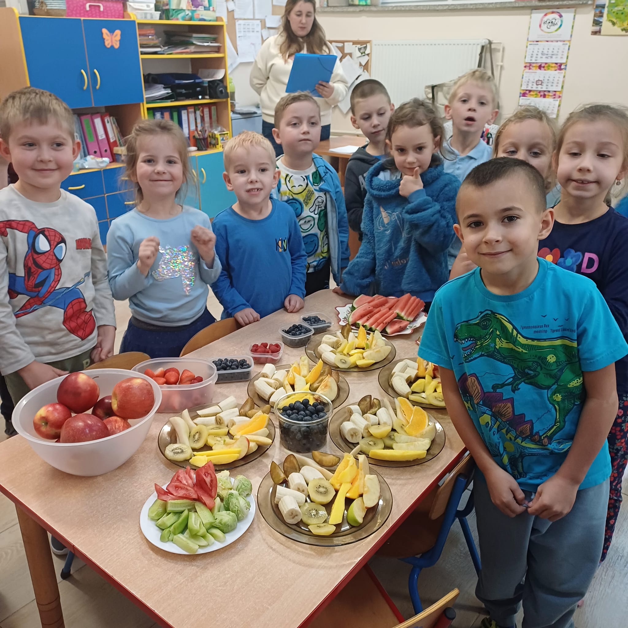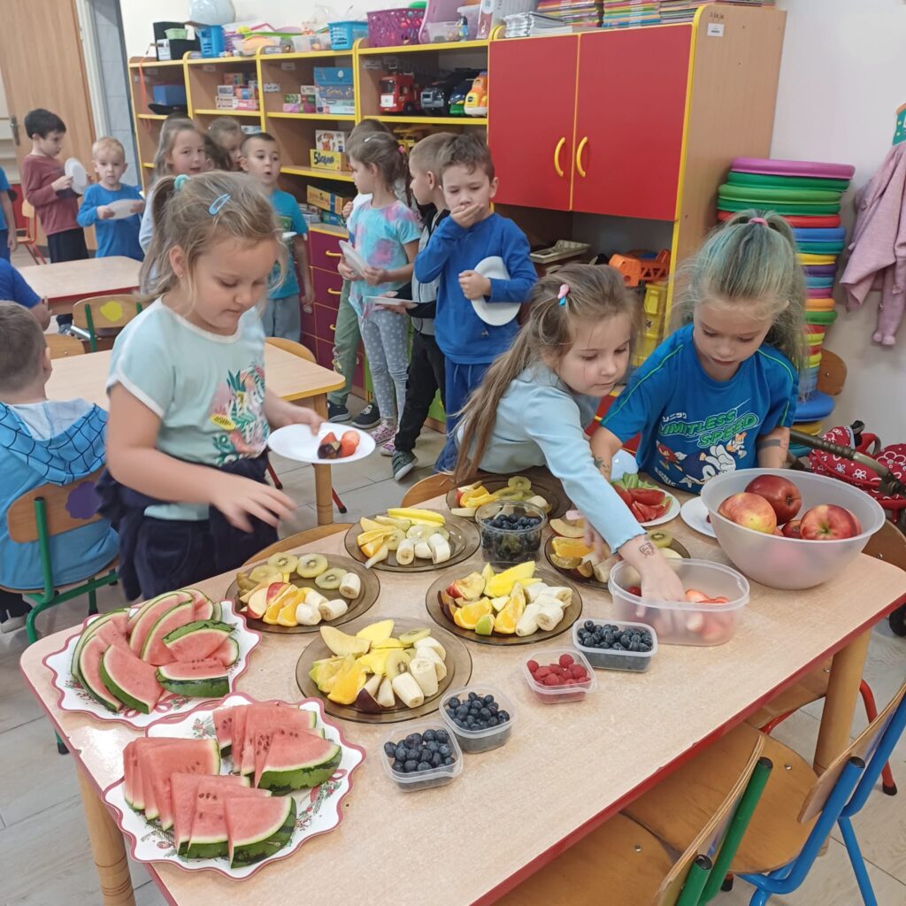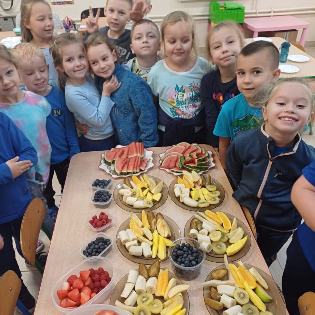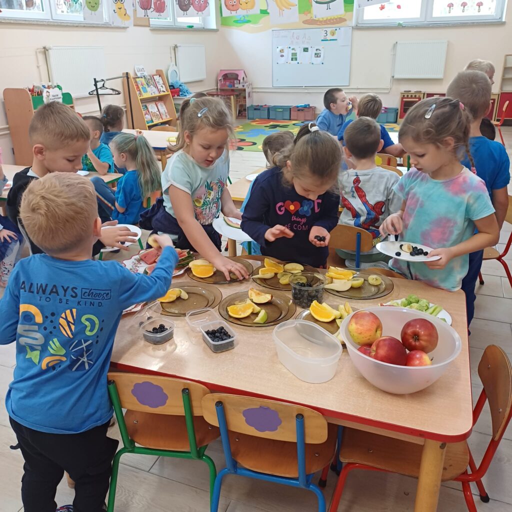 Dzisiaj na talerzach królowały owoce i warzywa! Dzieci aktywnie brały udział w przygotowanych zajęciach. Rozróżniały smaki, kolory i tekstury. Uczyły się, dlaczego owoce i warzywa są tak ważne w codziennej diecie. To był pyszny, kolorowy i pełen wiedzy dzień. Wierzymy, że te praktyczne doświadczenia pomogą im wykształcić zdrowe nawyki na całe życie!